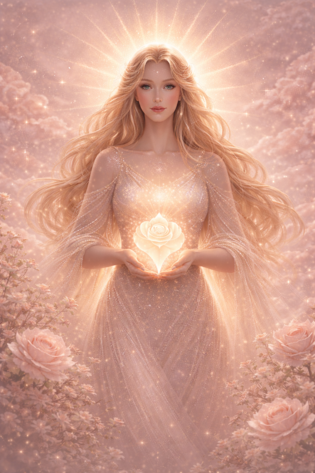 She holds the rose at her center.