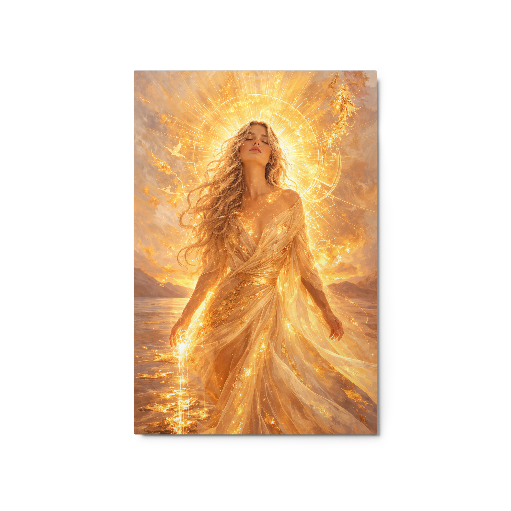 A soft field of golden light surrounds the figure, creating a steady visual presence that draws the eye without overwhelming the room. The composition is centered and grounded, allowing the piece to settle naturally into its environment while adding depth and atmosphere.